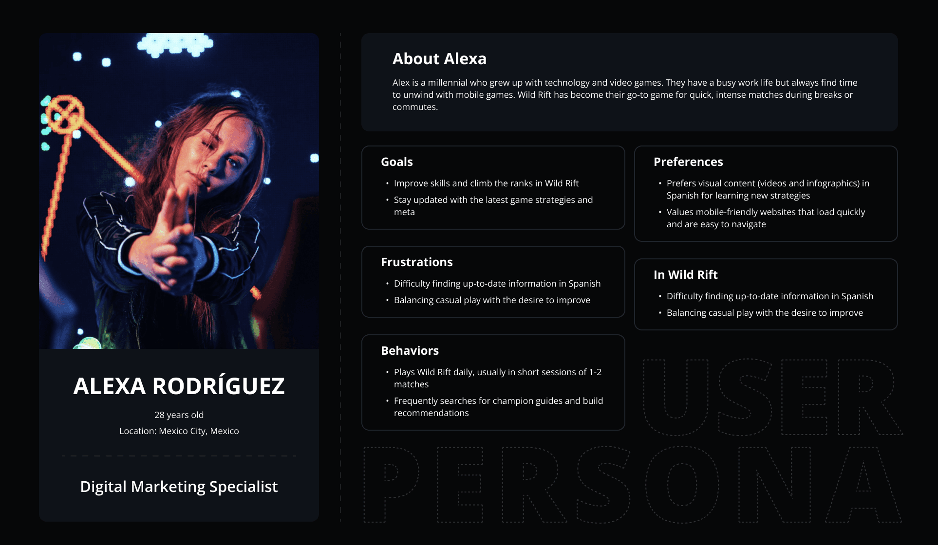 This comprehensive research led to the creation of three distinct user personas, with our primary focus on 'Alexa,' a Marketing professional seeking quick, reliable information to enhance her evening gameplay.